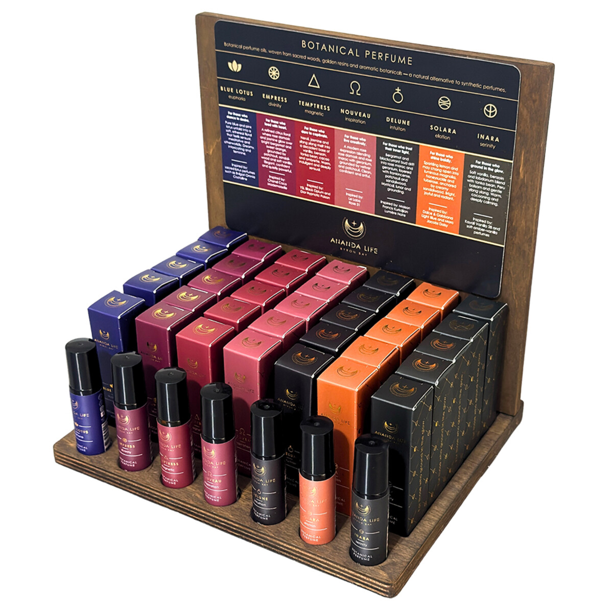 Similar products in the same range as Ananda Life Botanical Perfume STAND incl. wooden display stand, cardboard POS header board and 1 x tester of each botanical perfum