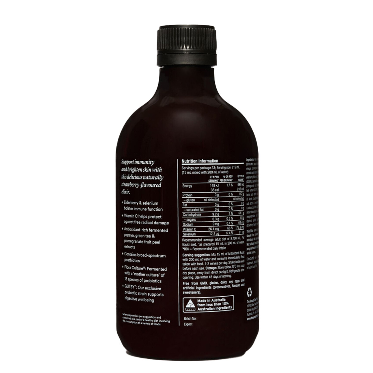Ingredients: Flora Culture™ Bio-Fermented Blend (fermented papaya fruit juice concentrate (41%), apple cider vinegar, pomegranate fruit juice concentrate, lactic acid, cellulose gum, vitamin C, elderberry extract (0.07%), papaya leaf extract (0.05%), Lactobacillus rhamnosus GUT5Y™ (0.05%), pomegranate fruit peel extract (0.01%), green tea leaf extract (0.01%), selenium), glycerol, natural strawberry flavour, stevia leaf extract.