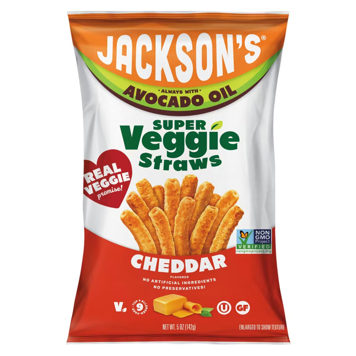Jackson's Super Veggie Straws Powder Blend (Yellow Peas, Brown Rice, Cassava, Sweet Potato), Avocado Oil, Cheddar Flavor Seasoning (Tapioca Solids, Salt, Tomato Powder, Natural Flavor, Onion Powder, Yeast Extract, Garlic Powder, Citric Acid, Lactic Acid, Paprika Extract, Spices, Rosemary Extract (Antioxidant)).
