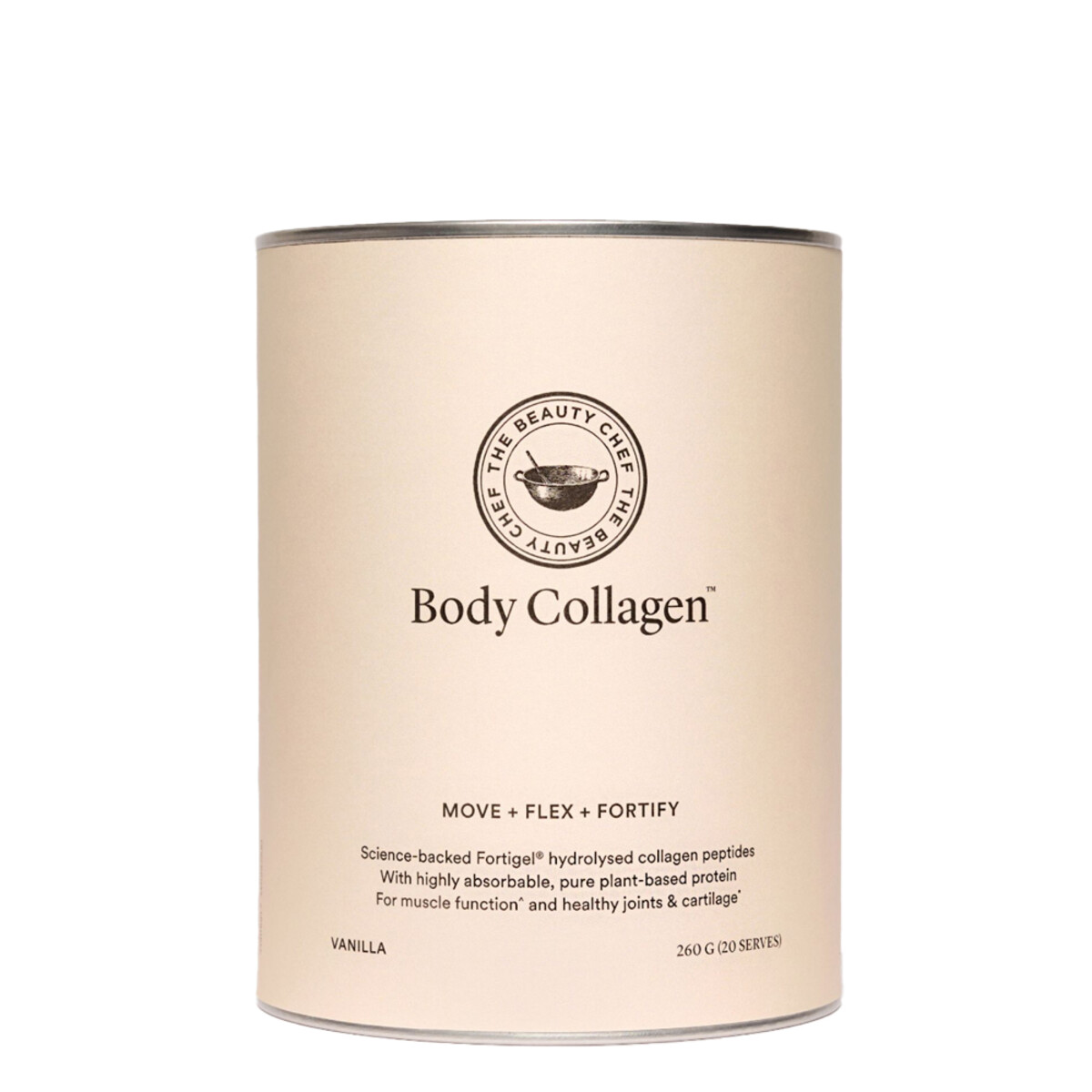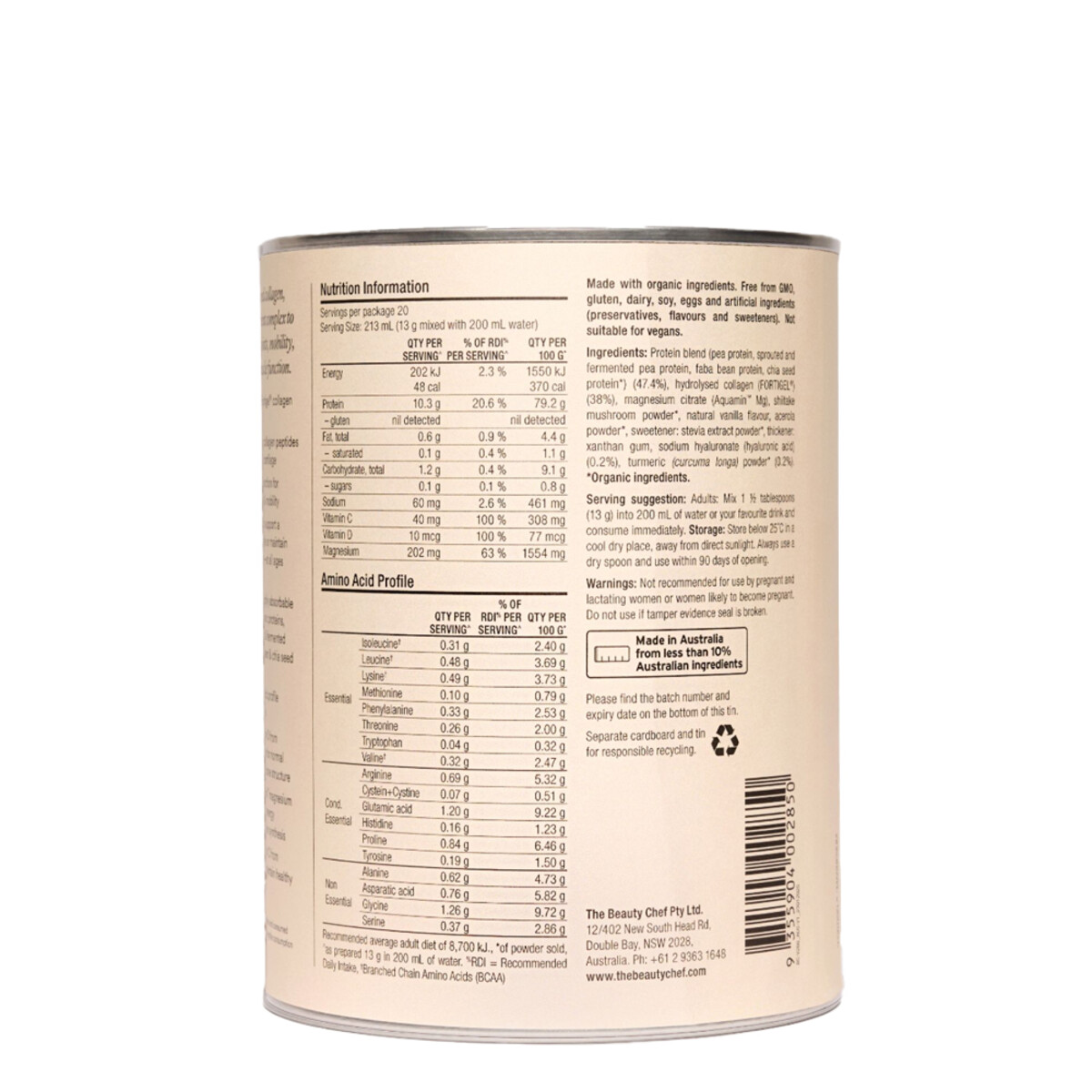 Ingredients: Protein blend (pea protein, sprouted and fermented pea protein, faba bean protein, chia seed protein*) (47.4%), hydrolysed collagen (FORTIGEL®) (38%), magnesium citrate (Aquamin Mg®), shiitake mushroom powder*, natural vanilla flavour, acerola powder*, sweetener: stevia extract powder*, thickener: xanthan gum, sodium hyaluronate (hyaluronic acid) (0.2%), turmeric (curcuma longa) powder* (0.2%). *Organic ingredients.