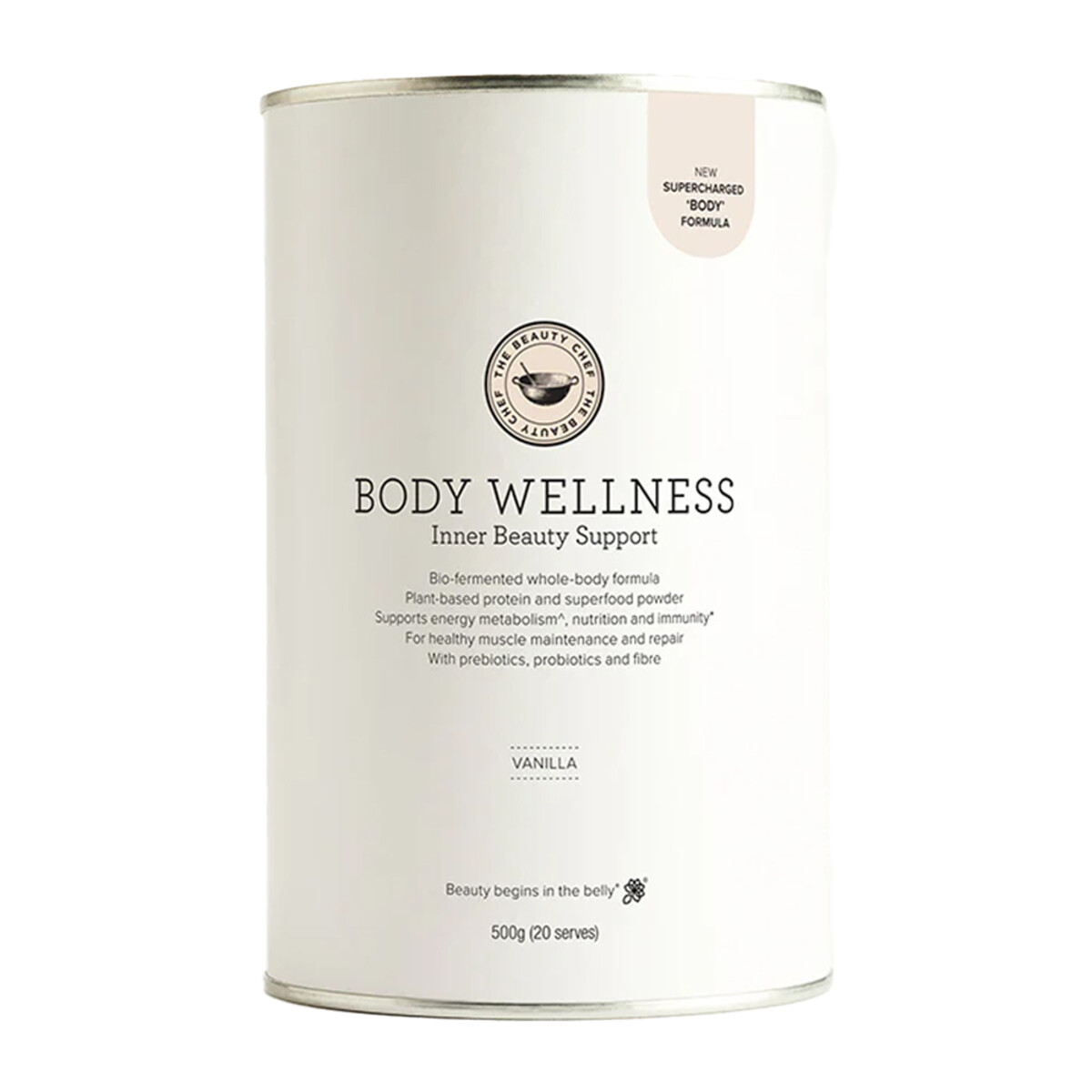 Ingredients: Sprouted fermented pea protein* (56.2%), sprouted pea fibre* (24%), Jerusalem artichoke inulin* (5.4%), sprouted brown rice protein* (4%), natural vanilla flavour (2.6%), acerola powder* (1.3%), matcha powder* (1.3%), shiitake mushroom powder* (1%), oat grass powder* (0.8%), greens blend (spirulina, chlorella, alfalfa grass, wheat grass, barley grass)* (0.8%), fruit & vegetable blend (beetroot, carrot, kale, spinach, acai, apple, grape, broccoli sprout)* (0.48%), chia seed* (0.4%), hemp powder* (0.4%), stevia leaf extract* (0.36%), Bio-Fermented Nutrient Blend with Flora Culture® [(chickpeas*, mung beans*, brown rice*, sweet potato*, lentils*, buckwheat*, quinoa*, millet*, sea minerals, pepitas*, linseed*, sunflower seeds*, agave*, molasses*, queen garnet plum, ginger rhizome*, lemon juice concentrate, lactic acid starter culture (Bifidobacterium infantis, B. lactis, Lactobacillus acidophilus, L. delbrueckii sub. lactis, L. fermentum, L. paracasei, L. rhamnosus, Lactococcus lactis sub.cremoris, L. lactis sub. lactis biovar diacetylactis, L. lactis sub. lactis, Leuconostoc mesenteroides, L. pseudomesenteroides)) (0.4%), xanthan gum, berry blend (strawberry*, raspberry, blueberry*, cherry, pomegranate*, cranberry) (0.08%), cinnamon bark powder* (0.08%), Lactobacillus rhamnosus GUT5Y™ (0.05%) and maqui berry powder* (0.04%). *Organic ingredients