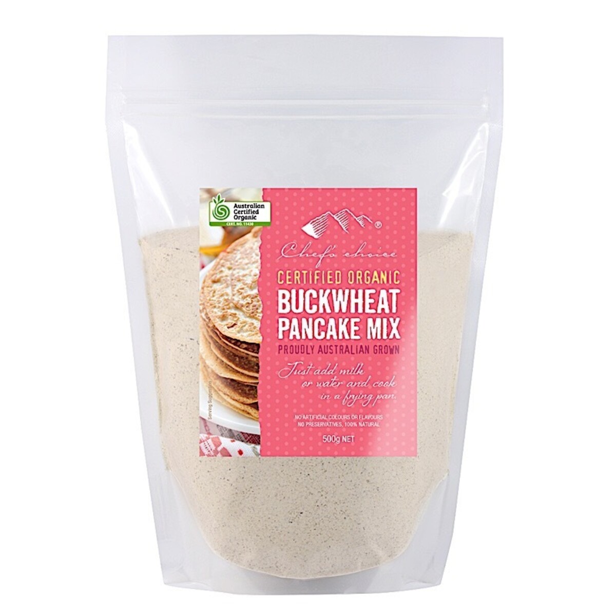 Chef's Choice Certified Organic Buckwheat Pancake Mix is made from a blend of high-quality buckwheat, maize flour and other organic ingredients that create a soft textured pancake with a nutty taste.
