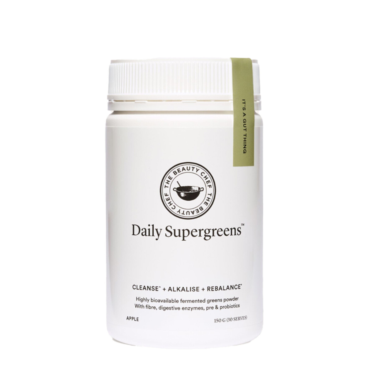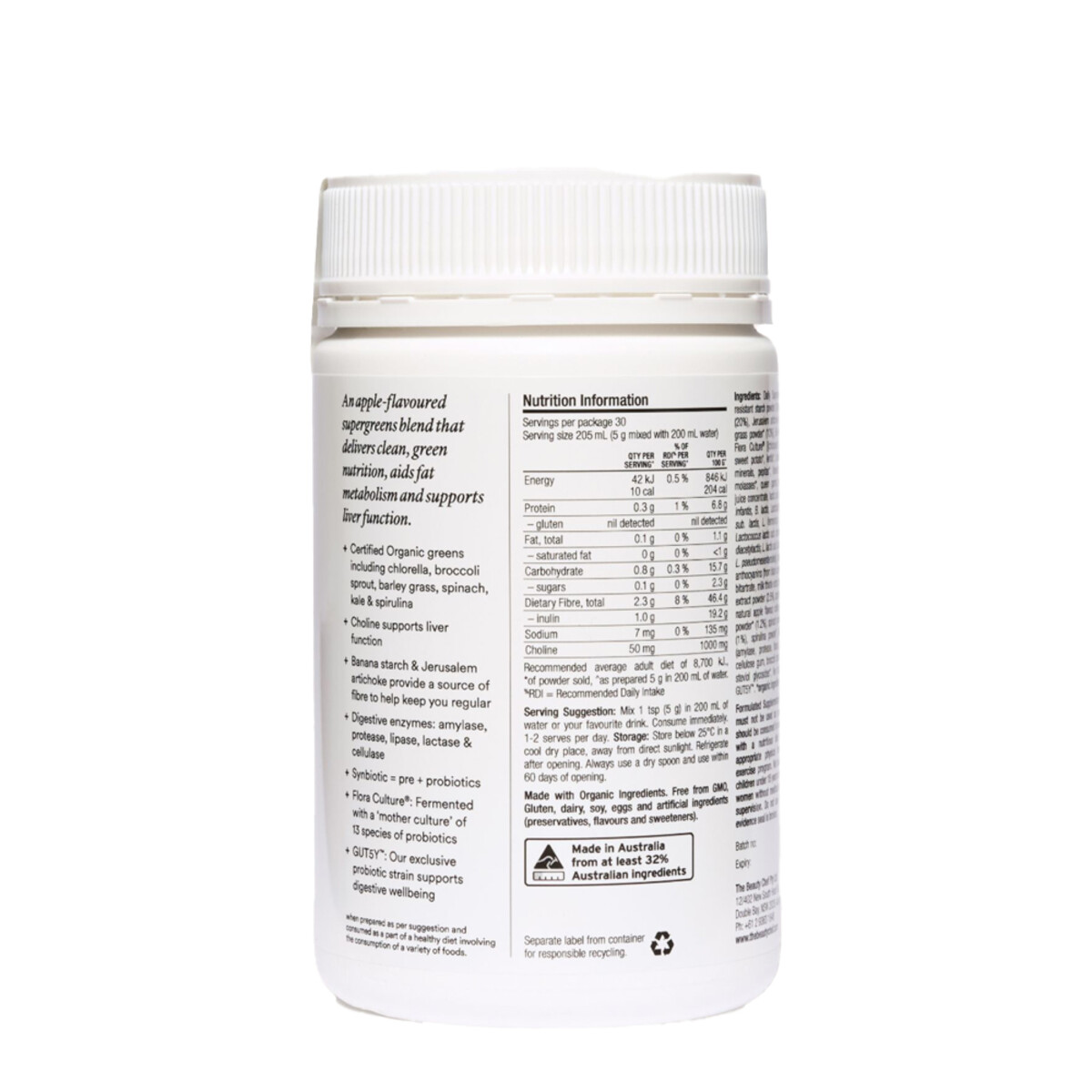 Ingredients: Daily Supergreens Blend [(green banana resistant starch powder (22%), sprouted pea fibre powder* (20%), Jerusalem artichoke inulin powder* (20%), barley grass powder* (9.7%))], Bio-Fermented Nutrient Blend with Flora Culture™ [(chickpeas*, mung beans*, brown rice*, sweet potato*, lentils*, buckwheat*, quinoa*, millet*, sea minerals, pepitas*, linseed*, sunflower seeds*, agave*, molasses*, queen garnet plum, ginger rhizome*, lemon juice concentrate, lactic acid starter culture (Bifidobacterium infantis, B. lactis, Lactobacillus acidophilus, L. delbrueckii sub. lactis, L. fermentum, L. paracasei, L. rhamnosus, Lactococcus lactis sub. cremoris, L. lactis sub. lactis biovar diacetylactis, L. lactis sub. lactis, Leuconostoc mesenteroides, L. pseudomesenteroides)), natural colour: turmeric rhizome*, anthocyanins (from black carrot), maqui berry*] (8%), choline bitartrate, milk thistle extract powder (2.5%), globe artichoke extract powder (2.5%), natural apple flavour, apple cider vinegar powder* (2.2%), collard greens powder* (1.2%), kale powder* (1.2%), spinach powder* (1.2%), chlorella powder* (1%), spirulina powder* (1%), Digestive Enzyme Blend (amylase, protease, lipase, lactase and cellulase) (1%), acacia gum powder* (0.7%), broccoli sprout powder* (0.4%), sweetener: steviol glycosides*, live culture: Lactobacillus rhamnosus GUT5Y™. *organic ingredients