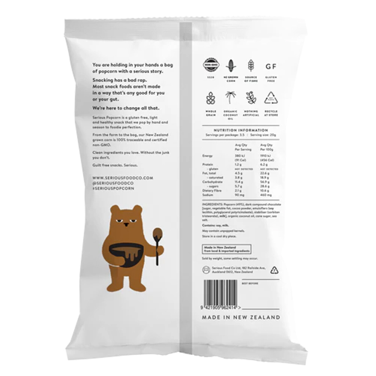 Ingredients: Popcorn* (49%), dark compound chocolate [sugar, vegetable fat, cocoa powder, emulsifiers (soy lecithin, polyglycerol polyricinoleate), stabiliser (sorbitan tristearate), milk], organic coconut oil, cane sugar, sea salt.