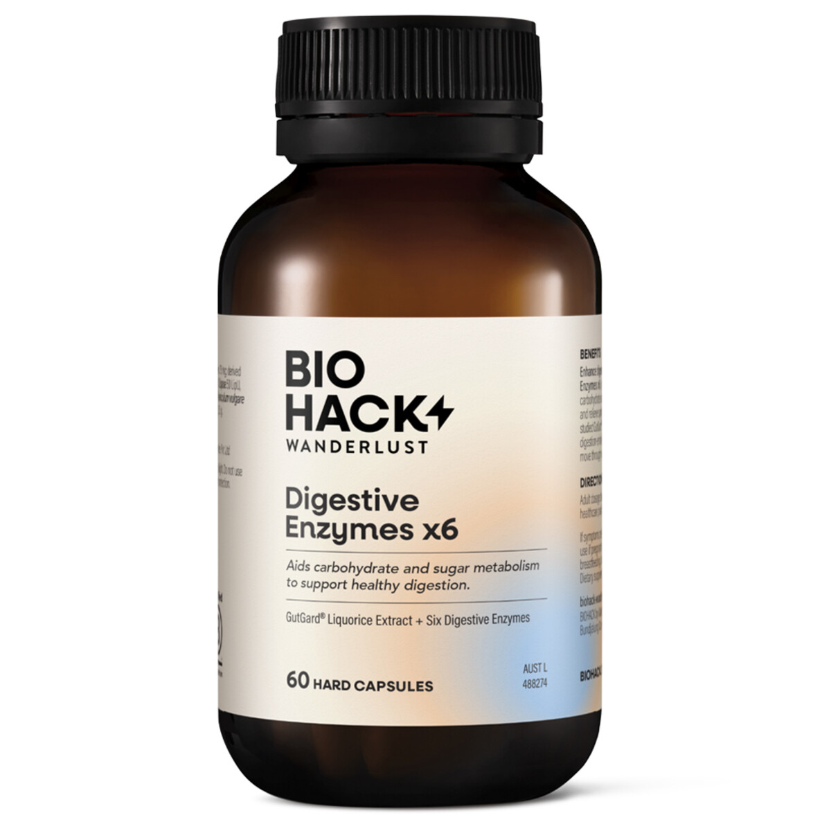 Enhance digestive function with BioHack Wanderlust Digestive Enzymes x6, an evidence-backed formulation designed to aid carbohydrate and sugar metabolism, support dietary fat digestion and relieve symptoms of indigestion. Precision-crafted with clinically studied GutGardĀ® and six digestive enzymes, each targeted dose delivers digestion-enhancing ingredients — so you can digest comfortably and move through your day with ease.