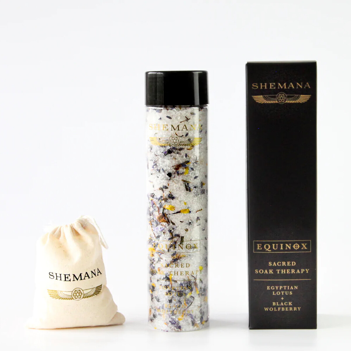 Australian Sea Salt (Sodium Chloride), Magnesium Sulfate (Epsom salt), Lavender Petals, Black Wolfberry, Juniper Berries, Egyptian Lotus Flowers (Nymphaea caerulea), ESSENTIAL OILS: Frankincense, Peru Balsam, Cedarwood.