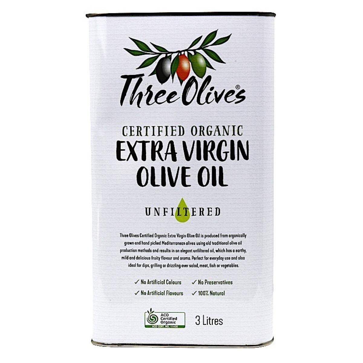 Three Olives Certified Organic Extra Virgin Olive Oil is produced from organically grown and hand picked Mediterranean olives using traditional olive oil production methods.