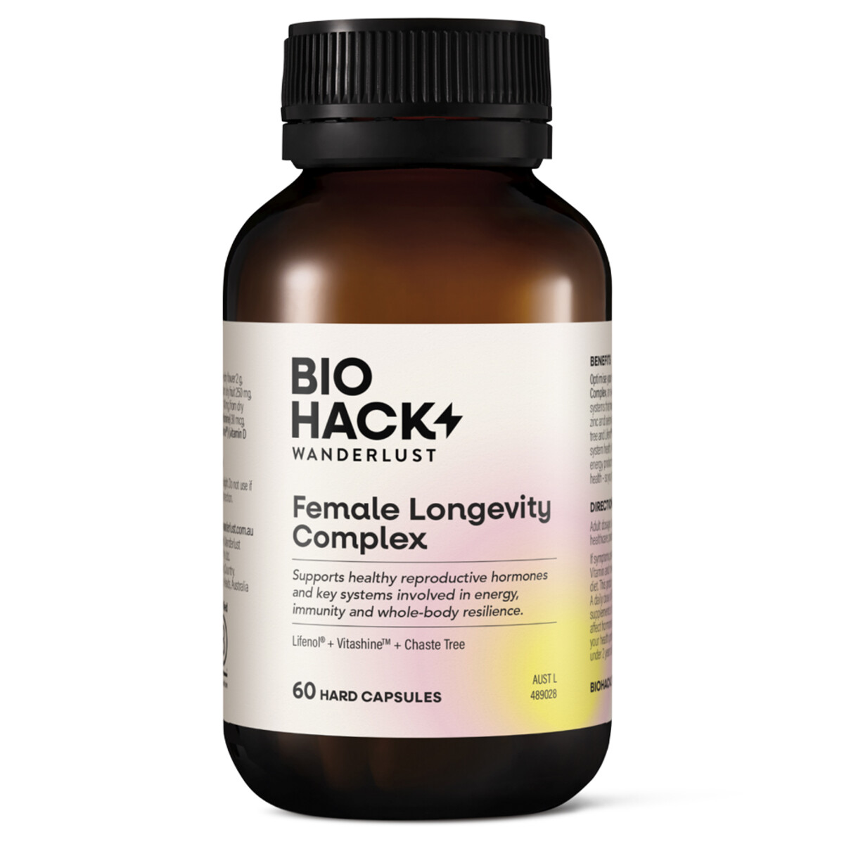Optimise your vitality with BioHack Wanderlust Female Longevity Complex, an evidence-backed formulation designed to support the systems that matter most. Precision-crafted with VitashineTM vitamin D, zinc and selenium, alongside herbs traditionally used in Western Herbal Medicine including chaste tree and Lifenol® hops. Each targeted dose supports female reproductive system health, immune function, bone mineralisation, antioxidant defences, energy production, thyroid hormone production and nervous system health – so you can stay strong, centred and in sync at every stage of life.