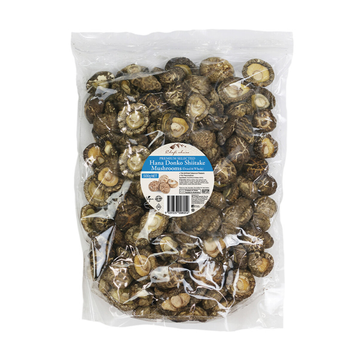 Chef's Choice Premium Selected Hana Donko Shiitake Mushrooms - Dried & Whole are flavourful and are one of the most popular gourmet mushroom varieties used.