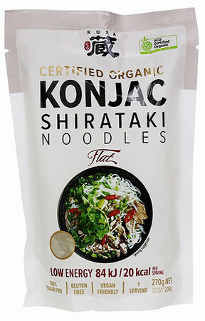 Kura Certified Organic Konjac Shirataki Noodles Flat are made from an all-natural vegetable Konjacmannan; a water-soluble dietary fibre that has been a traditional staple in Japan for hundreds of years. Proven to be beneficial for aiding digestion, it’s low in carbohydrates and is just simply the perfect noodles to enjoy all your favourite noodle dishes!