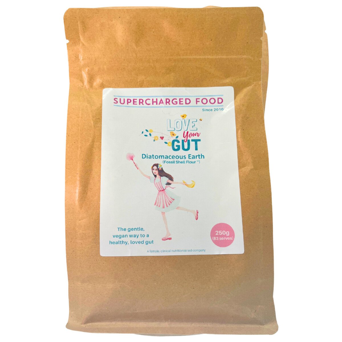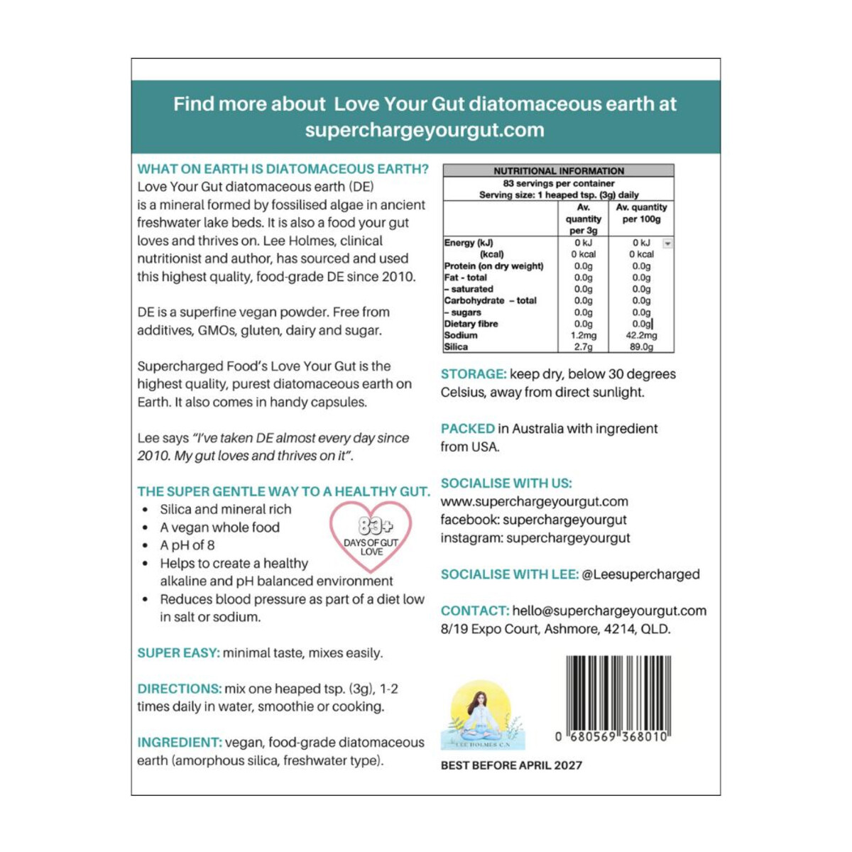 Developed by Lee Holmes of Supercharged Food, Love Your Gut is 100% highest food-grade diatomaceous earth.