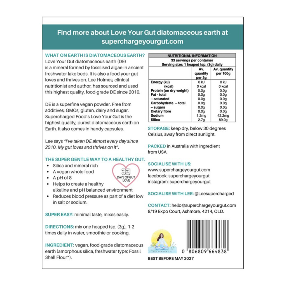 Developed by Lee Holmes of Supercharged Food, Love Your Gut is 100% highest food-grade diatomaceous earth.