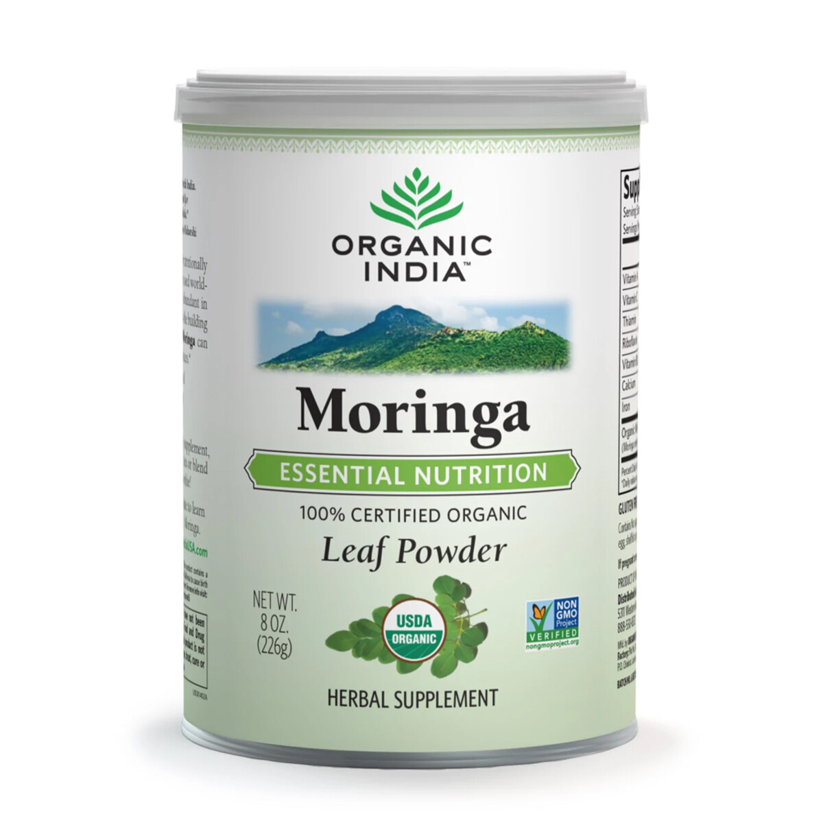 Native to India and Africa, Moringa (Moringa oleifera) is a nutritionally complex superfood. Organic India Organic Moringa Leaf Powder contain essential nutrients including Vitamin C, iron, calcium, plant protein, and potassium. An antioxidant-rich superfood, Moringa is thought to support a healthy immune system, help maintain healthy metabolism, and is a superb source of protein for vegans and vegetarians because it contains all nine essential amino acids.