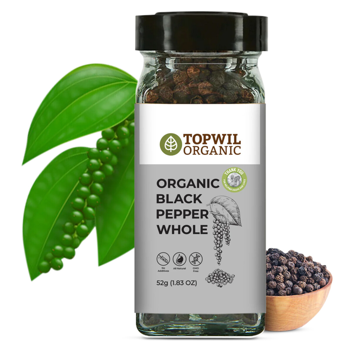 Topwil Organic Black Pepper Whole is sustainably grown in organically certified farms. Adds a warm flavour and works especially well in soups, stews, and curries.