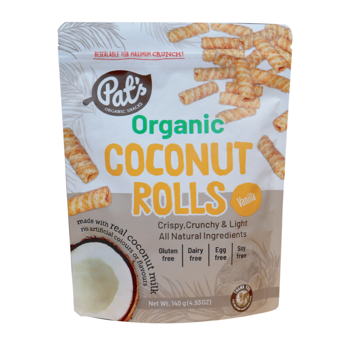 Pat’s Organic Coconut Rolls are light and crispy snacks made with real organic coconut milk. While offering you a unique crispy texture, this vegan-friendly snack is rolled using a traditional method avoiding extrusion techniques to preserve the goodness and nutrition for you. Munch on these Coconut Rolls as a crunchy snack, sprinkle as a flaky topping, or dip in your morning cup of tea or coffee.