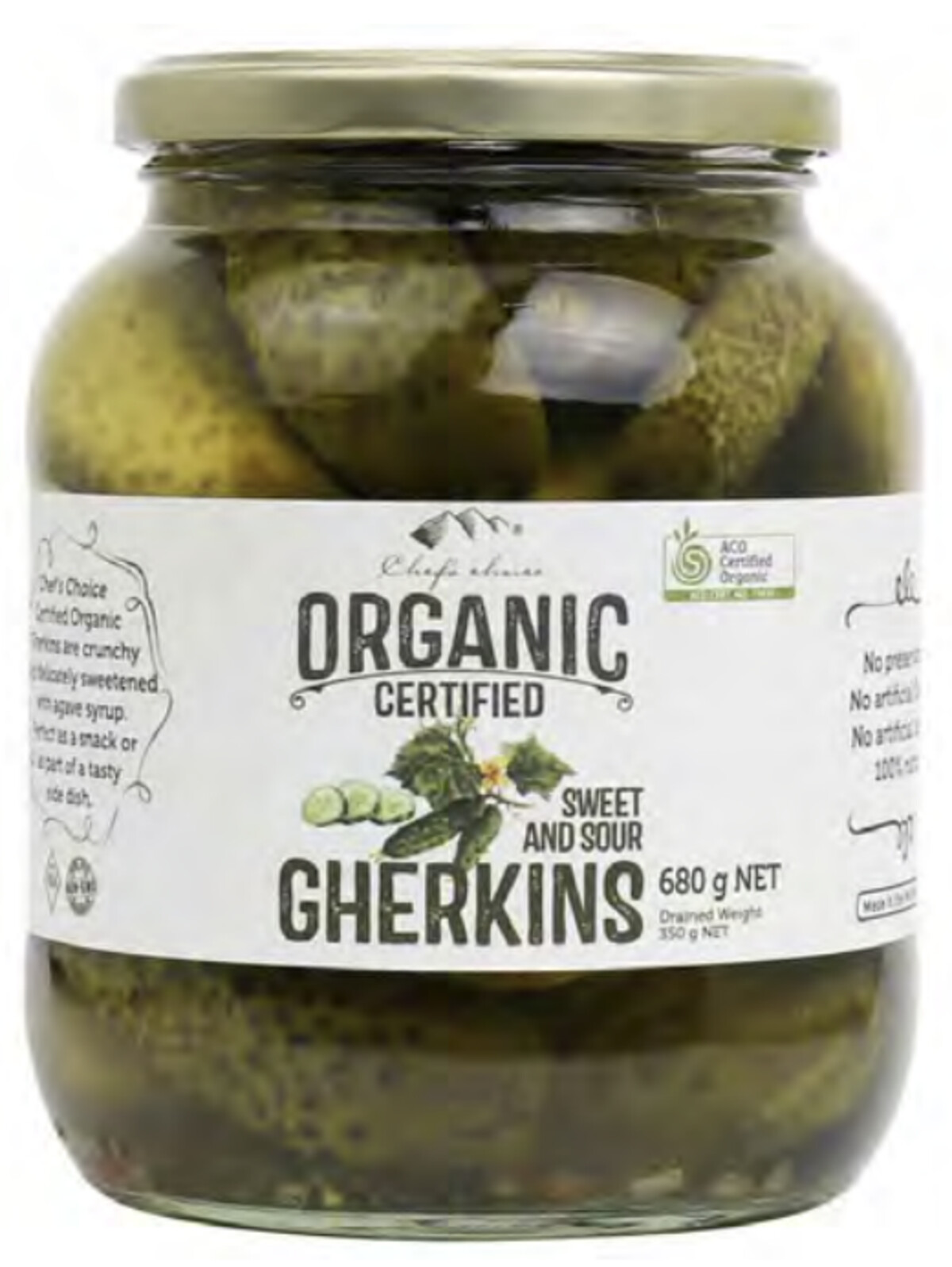 Ingredients: Gherkins* (51%), Vinegar*, Water, Agave*, Sea Salt, Mustard Seeds*, Dill*, Onion*, Red Pepper*. (*Organic ingredient)