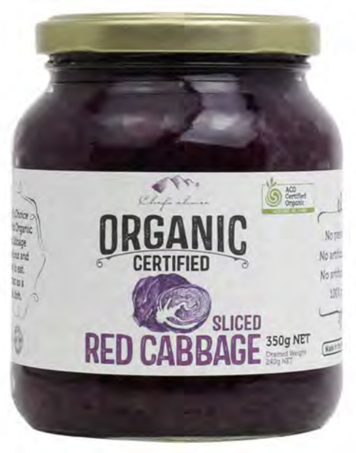Ingredients: Red Cabbage (69%)*, Water, Vinegar*, Agave Syrup*, Sea Salt, Clove*. (*Organic ingredient)