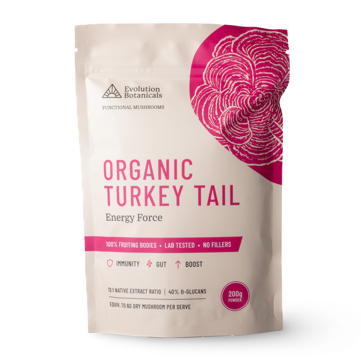Ingredients: Certified Organic Turkey Tail Mushroom Extract Powder >40% ?-glucans. We take a full spectrum approach carefully blending Turkey Tail 12:1 hot water extract > 40% ?-glucans and whole mushroom powder. Vegan Friendly, Free from Soy, Gluten, Dairy and Non-GMO.