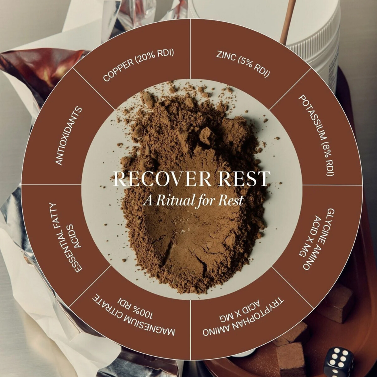 Discover the science of feeling good and sleeping better with RECOVER REST, a mineral-rich, low-calorie blend of cocoa and coconut, formulated to promote muscle recovery, increase serotonin, and support deeper sleep cycles. This delicious, science-backed formula is your new go-to ritual for winding down, recharging, and waking up refreshed.