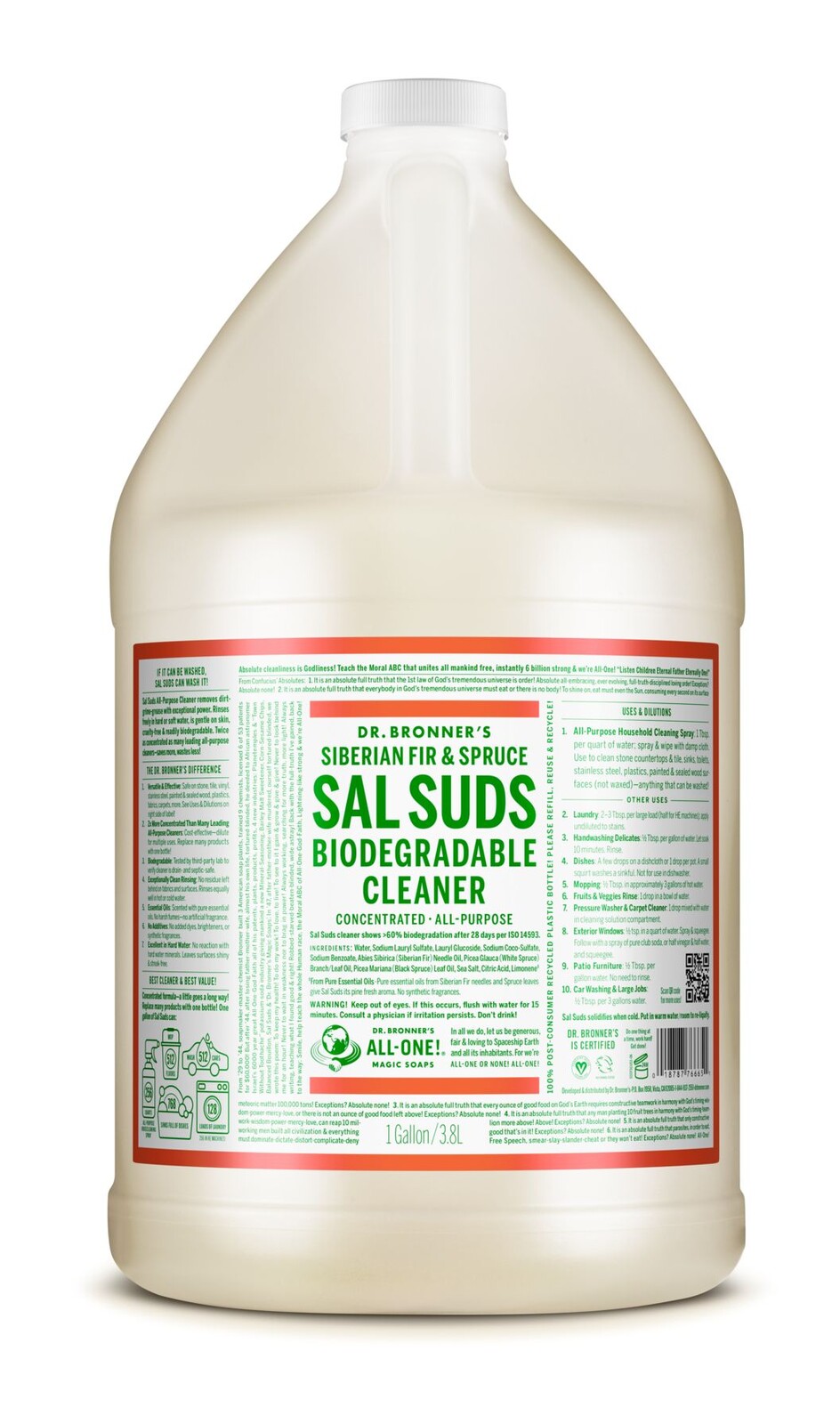 Dr. Bronner's Sal Suds Liquid Cleaner is not a soap but instead is a concentrated hard-surface all-purpose cleaner. It is made with plant-based surfactants and natural fir needle and spruce essential oils (no cheap, harsh pine stump oil), without any synthetic dyes, fragrances or preservatives. Perfect for general household cleaning (dishes, floors, laundry, etc.), it cleans and rinses with exceptional power, yet it is mild and gentle on the skin. Sal Suds Liquid Cleaner is equally effective in hard or soft water, rinsing freely, hot or cold. It is 100% cruelty-free, as certified by the Coalition for Consumer Information on Cosmetics, and it will biodegrade rapidly after doing its job.
