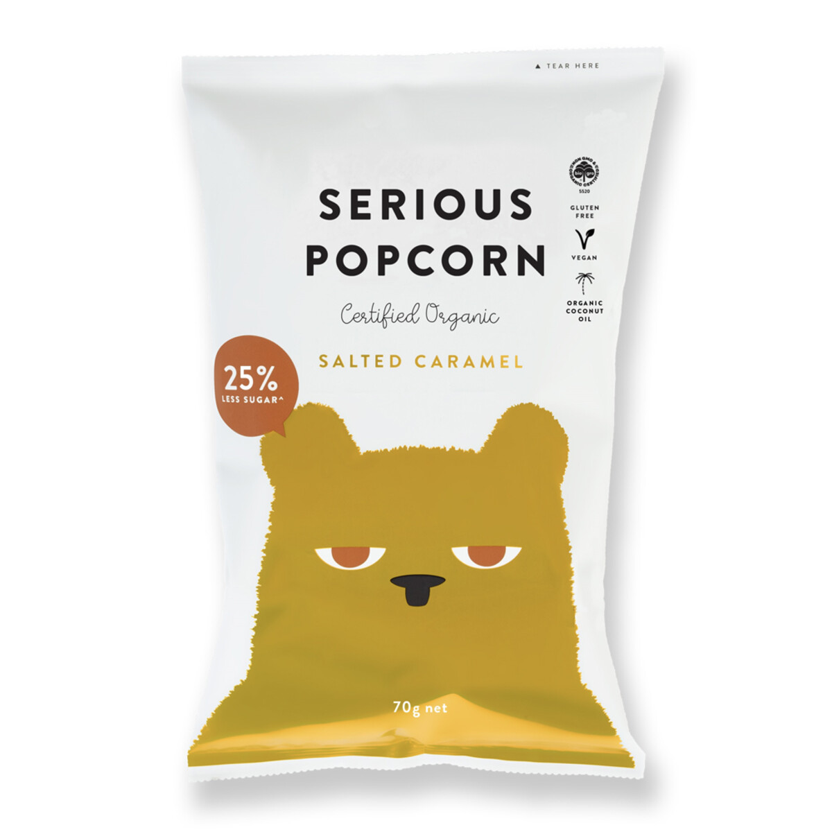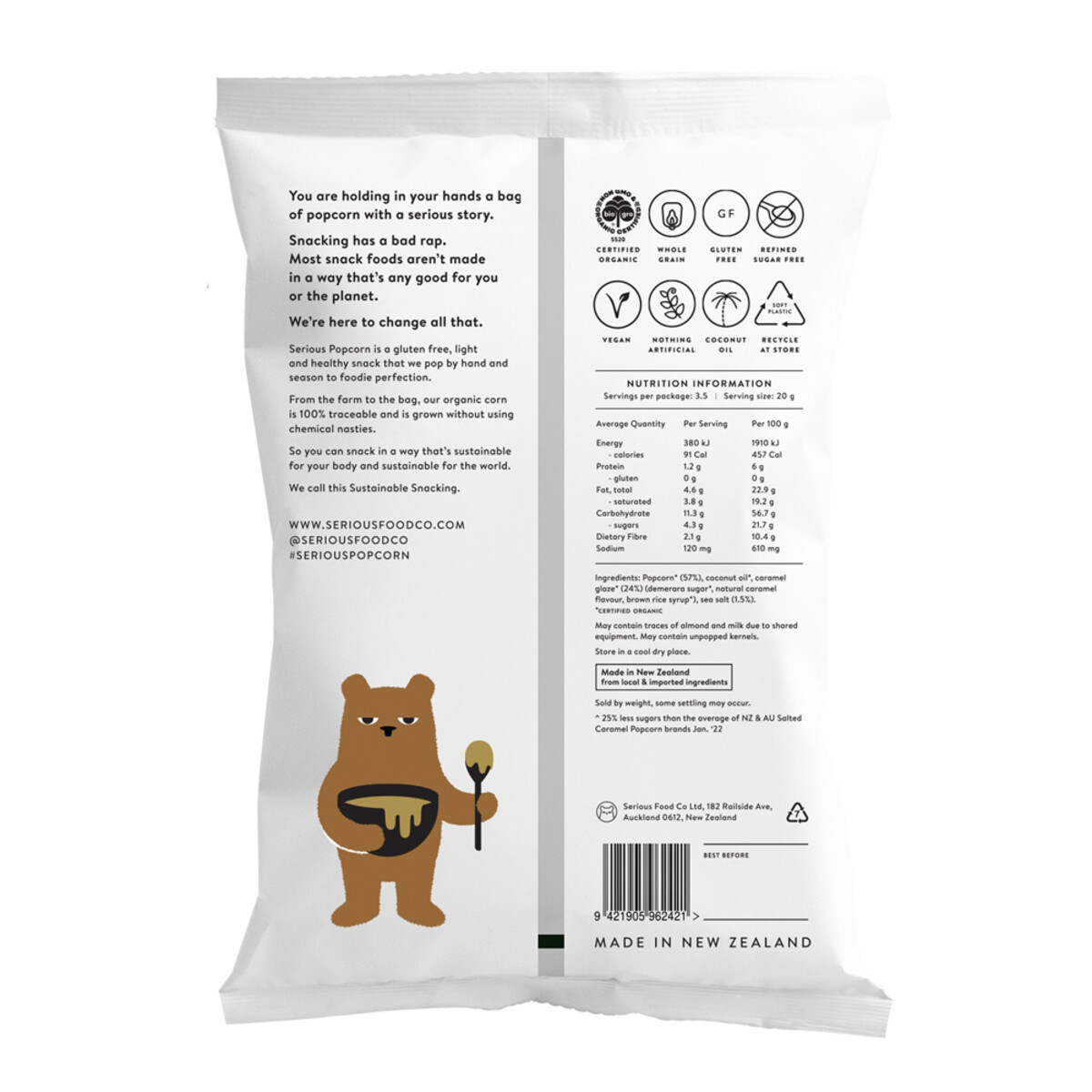 Popcorn* (57%), coconut oil*, caramel glaze* (20%) (demerara sugar*, natural caramel flavour, brown rice syrup*), sea salt (1.5%).*Certified organic