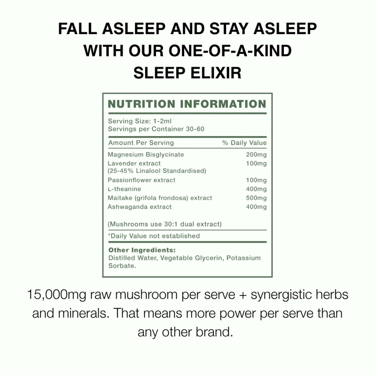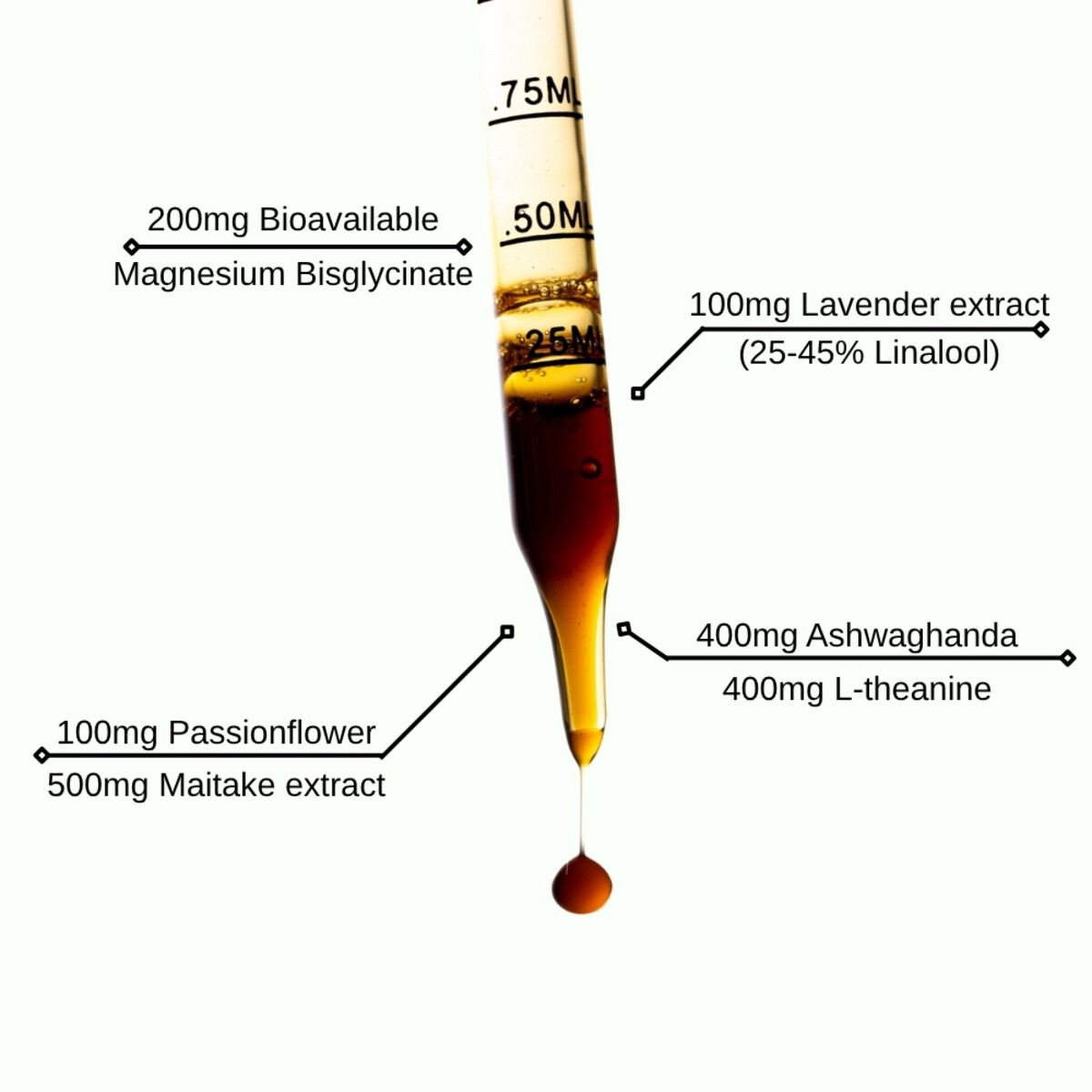 Ingredients: per 1ml: 200mg Magnesium Bisglycinate, 100mg Lavendar extract (Standardized to contain 25-45% Linalool), 100mg Passionflower extract, 400mg L-theanine, 500mg Maitake extract (equiv. 15000mg), 400mg Ashwaganda extract, Vegetable glycerine, Distilled water.