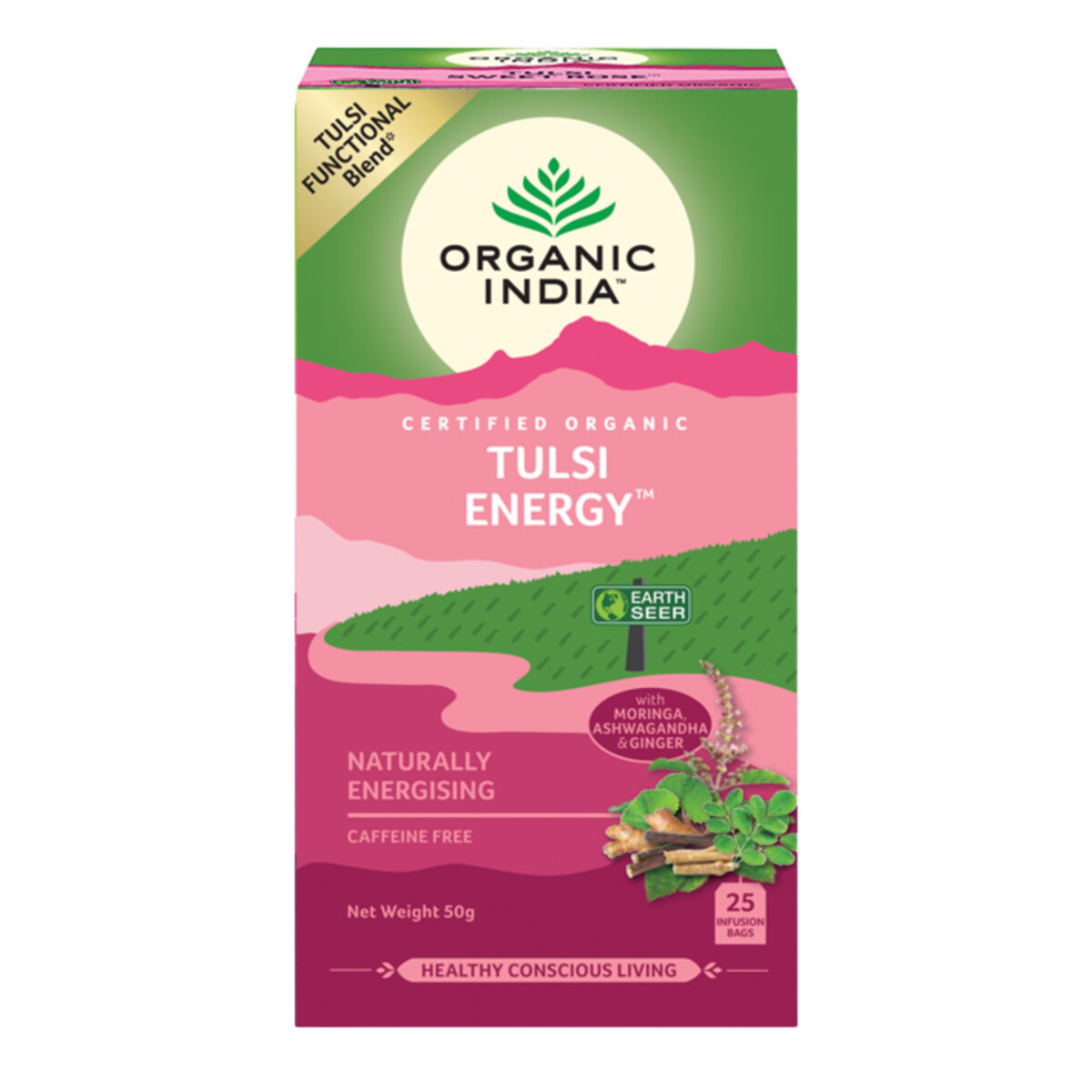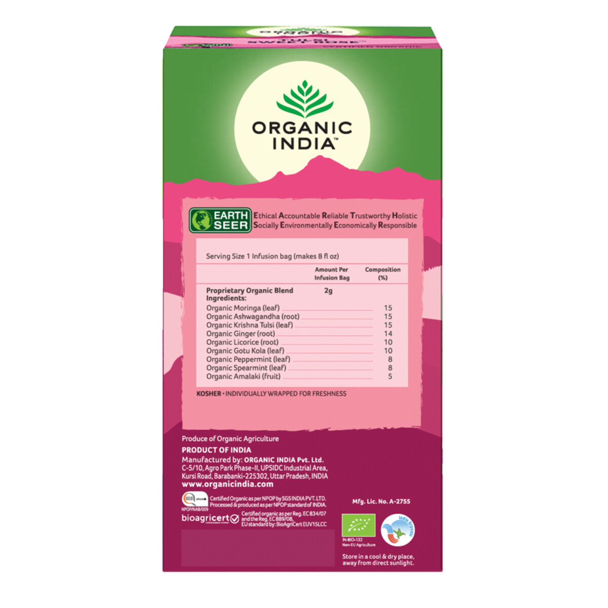 Ingredients: Organic Moringa (leaf), Organic Ashwaganda (root), Organic Krishna Tulsi (leaf), Organic Ginger (root), Organic Licorice (root), Organic Gotu Kola (leaf), Organic Peppermint (leaf), Organic Spearmint (leaf), Organic Amalaki (fruit)