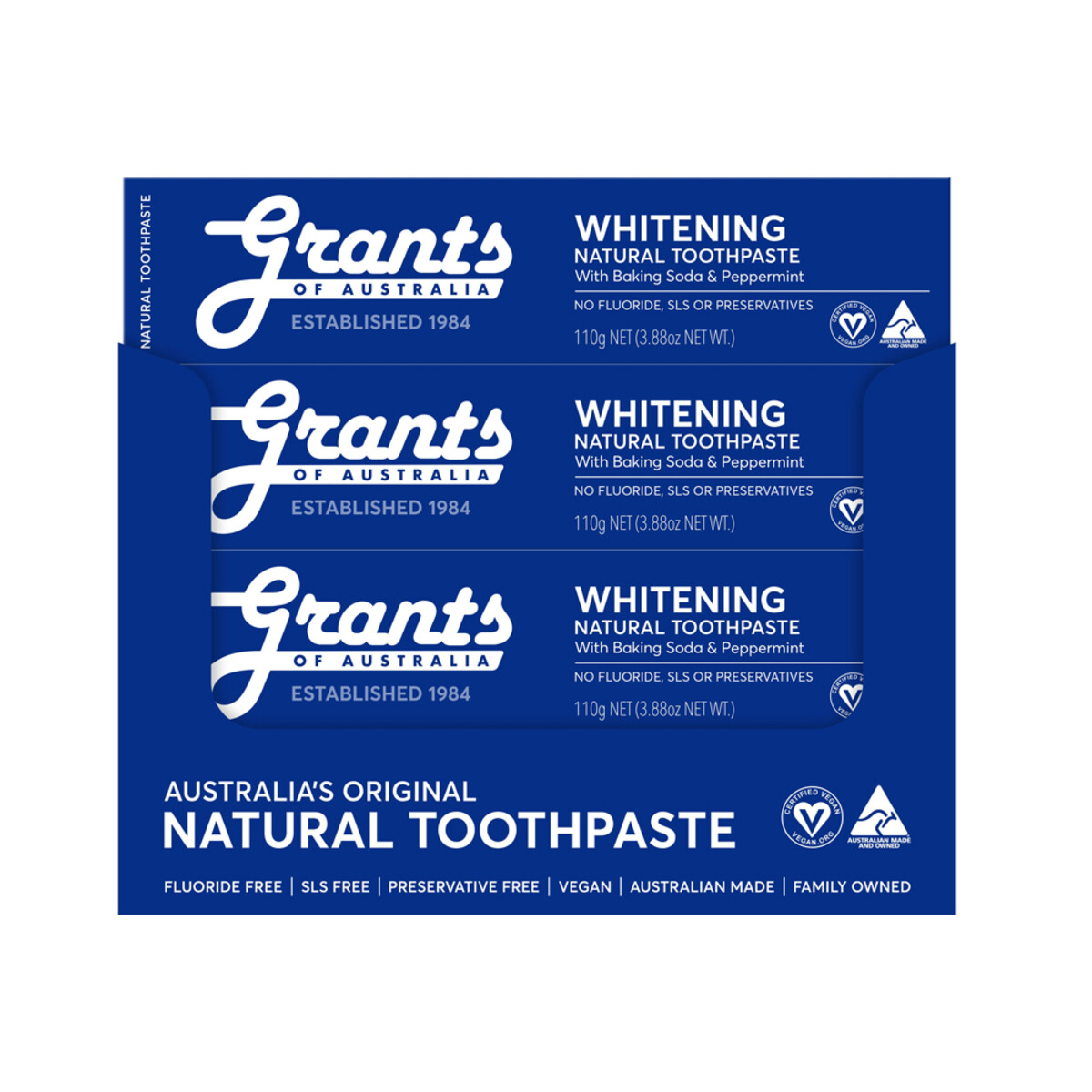 Grants Whitening toothpaste has a strong minty flavour and will leave the mouth feeling extra, extra fresh - thanks to baking soda which has been proven to naturally whiten teeth, remove stains AND reduce plaque build up.